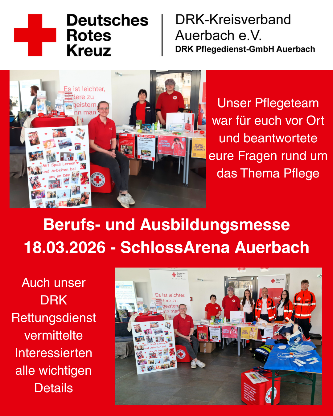 Am 18.03.2026 fand in der SchlossArena Auerbach die alljährliche Berufs- und Ausbildungsmesse statt. Natürlich waren auch wir wieder mit dabei. Wir informierten über die Ausbildung zur/zum Pflegefachfrau/-mann und Krankenpflegehelfer/in. Über einen Einstieg als Quereinsteiger, mit Optionen zur weiteren Qualifizierung konnte man sich auch aufklären lassen. Unser DRK Rettungsdienst war mit vor Ort, um über die Ausbildungen in ihrem Bereich zu informieren.