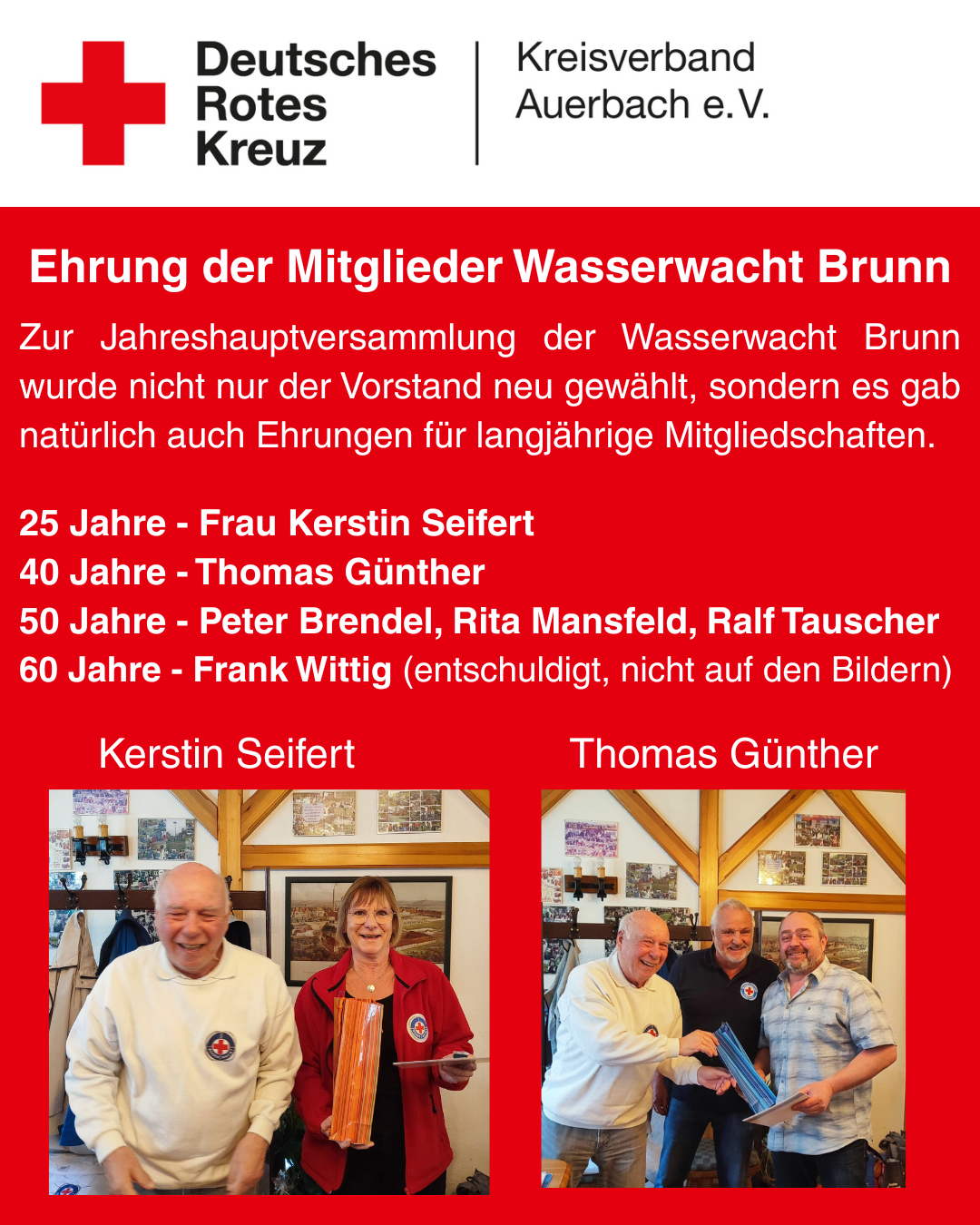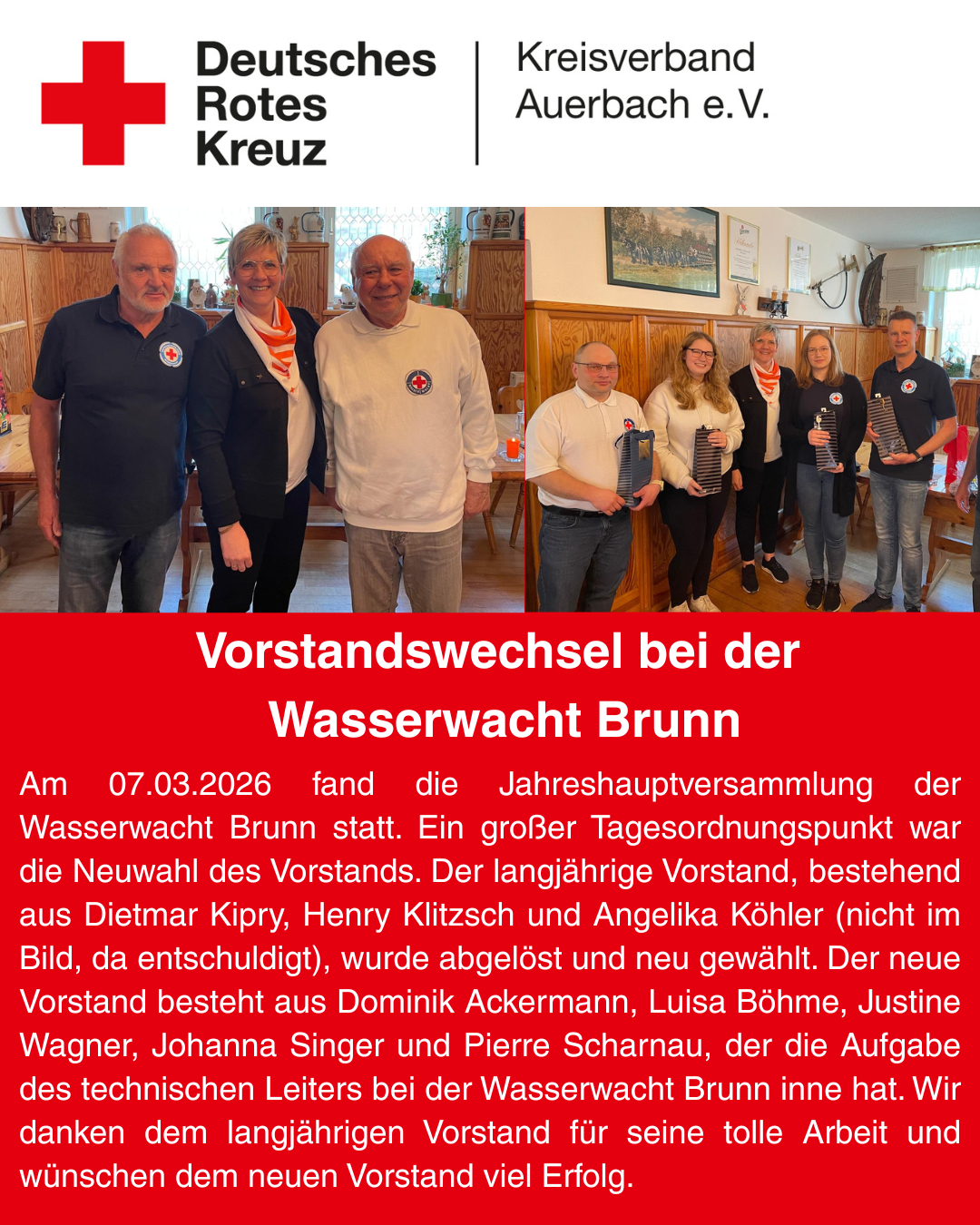 Am 07.03.2026 fand die Jahreshauptversammlung der Wasserwacht Brunn statt. An diesem Tag wurde der Vorstand neu gewählt. Zudem gab es Ehrungen für langjährige Mitgliedschaften.