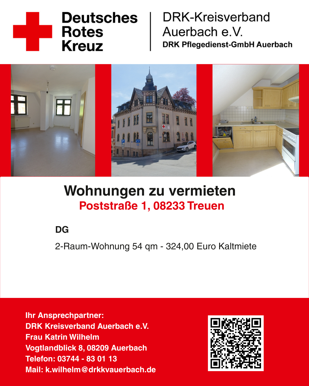 Auf der Poststraße 1, in Treuen, haben wir eine kleine süße 2-Raum-Dachgeschosswohnung zu vergeben. Mit ihren 54 qm ist sie optimal für Singles und Alleinlebende. Bei Interesse bitte einfach melden.