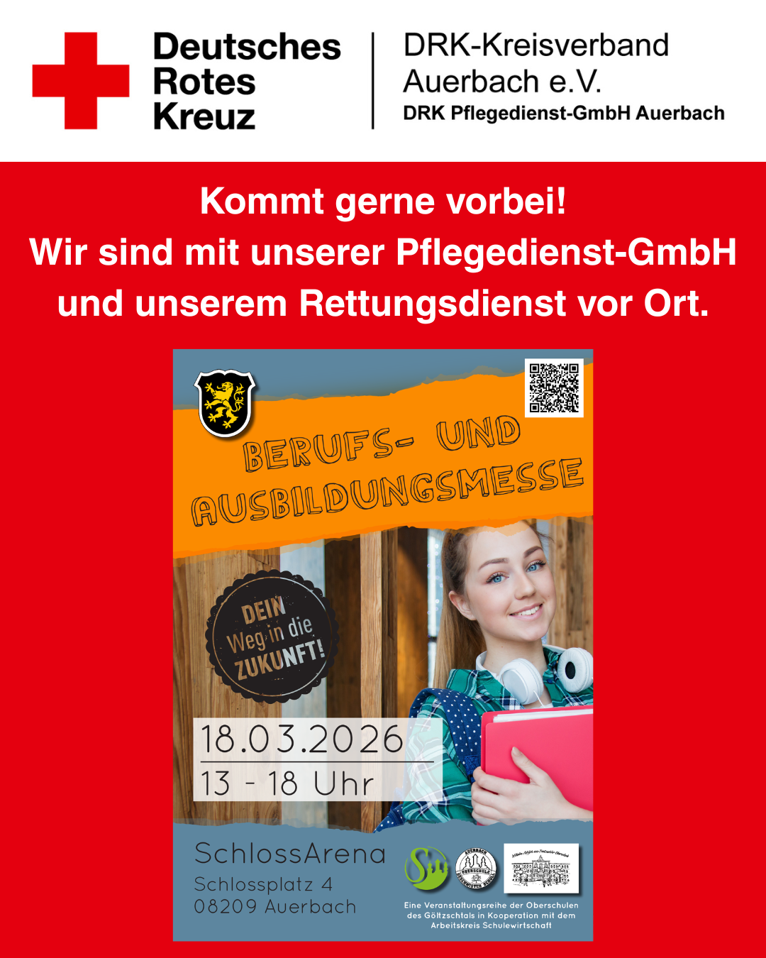 Kommt und besucht uns am 18.03.2026 auf der Ausbildungsmesse in der Schlossarena. Wir sind mit der Pflege und dem Rettungsdienst für euch vor Ort. Gerne beantworten wir euch all eure Fragen.